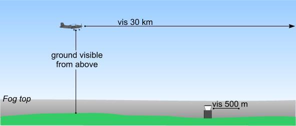 Pilots may be given a false sense of security when over-flying an airfield, since structures and runways may be quite clear to the pilot when looking down from directly above the airfield. However, when descending onto the approach, and trying to view the airfield at a slant angle through the fog, the pilot may very quickly lose all visual cues and find themselves in very serious difficulty.