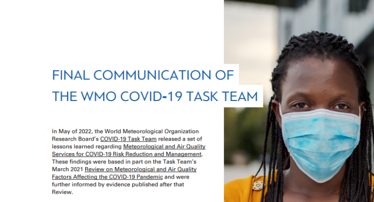 The WMO COVID-19 Task Team published a Briefing Note providing recommendations for national meteorological and hydrological services (NMHS) to facilitate the appropriate use of meteorological, climate and air quality information and services for COVID-19 and potential future pandemics. The publication presents the current state of understanding of meteorological and air quality (MAQ) affecting SARS-COV-2 transmission and COVID-19 severity, in particular referring to Seasonality, Air Quality and Compound Hazards.
