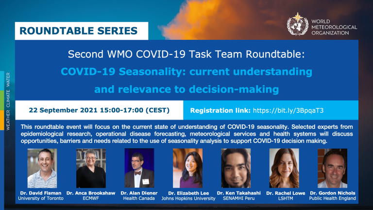 The WMO COVID-19 Task Team is hosting a series of virtual roundtable events on experiences with, and prospects for, actionable meteorologically-informed decision-making during the COVID-19 pandemic. These roundtables, undertaken in collaboration with the WMO-WHO Integrated Health Services Study Group, will also elicit lessons learned that can help guide the development of climate services for health.