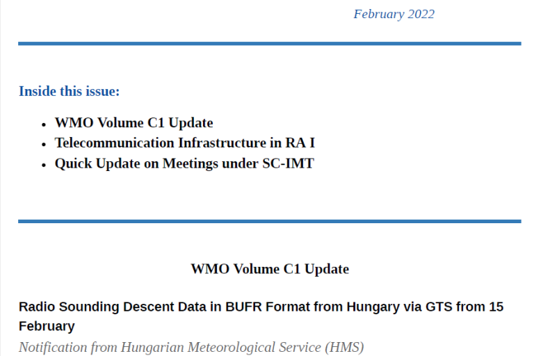 The latest WIS Newsletter is now available, covering the WMO Volume C1 update, telecommunication infrastructure in RA I (Africa), and the quick update on meetings under Standing Committee on Information Management and Technology (SC-IMT).