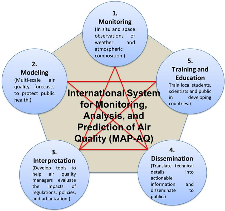- To develop and implement a global air pollution monitoring, analysis, and prediction system with downscaling capability in regions of the world that are affected by high levels of atmospheric pollutants, particularly in the low and middle-income countries.