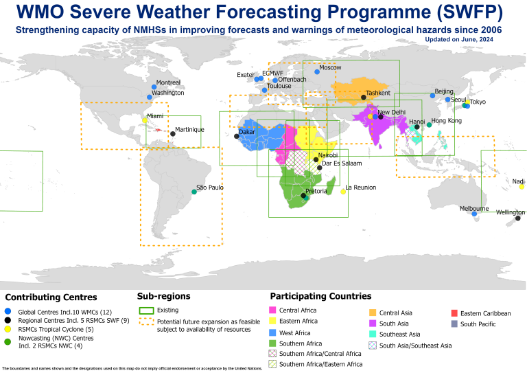 The WMO Severe Weather Forecasting Programme allows to improve forecasts and warnings of severe weather to save lives and livelihoods, and protect property and infrastructure. SWFP currently involves around 85 developing countries in nine sub-regions of the world including Southern Africa, Eastern Africa, West Africa, Central Africa, South-East Asia, South Asia, Central Asia, Eastern Caribbean and South Pacific, with contributions from the WMO Integrated Processing and Prediction System (WIPPS) and support from development partners and donors. In support of UN Early Warnings for All (EW4All) initiative, SWFP is being scaled up to expand its geographical coverage to more sub-regions and countries, and to facilitate improved tools and guidance products for the NMHSs to improve their early warning services. Recently, SWFP-Eastern Africa has been expanded to benefit more countries and SWFP implementation has also been initiated in Central America and Southeastern Asia-Oceania subregions. SWFP makes efficient use of the “Cascading Forecasting Process” (from global to regional to national level) with contributions from the WIPPS centres. SWFP, in collaboration with Public Weather Services (PWS) activity, has also been focusing on developing capacity of the participating countries on impact-based forecast and warning services (IBFWS) for improved decision-making, i.e. to deliver potential effects of forecast weather on users and stakeholders. SWFP contributes to several WMO long-term goals & strategic objectives.