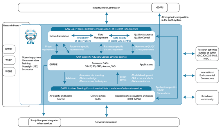 The Global Atmosphere Watch (GAW) Programme focuses on variability and trends in the composition of the global atmosphere and the related physical parameters. The Implementation Plan of the programme builds upon the growing importance of atmospheric composition observations and predictions and focuses on research that enables a wide variety of Products and Services related to atmospheric composition. GAW focal areas include stratospheric ozone and solar UV Radiation, reactive gases, greenhouse gases, aerosols and total atmospheric deposition. GAW addresses the aspects of the urban meteorology and environment through the dedicated GAW Urban Research Meteorology and Environment (GURME) project. The programme integrates the long-term observations from the dedicated research infrastructure, comprehensive quality assurance and quality control system and promotes open data sharing trough the dedicated world data centres. The programme contributes to the improvement of forecasting capability for air quality in support of disaster risk reduction and supports health applications through the Global Air Quality Forecasting and Analysis System. It addresses climate agenda by sustaining long-term global observations of the major climate change drivers and by developing the observation-based tools to improve knowledge of the greenhouse gas emissions via the Integrated Global Greenhouse Gas Information System (IG3IS). It supports biodiversity community through development of the global maps of the total atmospheric deposition through the Measurement-Model-Fusion for Global Total Atmospheric Deposition initiative. GAW coordinated observations also contribute to the implementation of the WMO Integrated Global Observing System (WIGOS). Capacity development remains a key GAW activity and it is implemented through GAW dedicated training events, support of summer schools, exchange of expertise and other means. All the elements of the programme are interconnected to support the productions of the society relevant services.