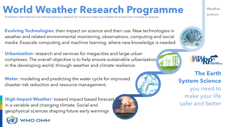 The World Weather Research Programme (WWRP) is the WMO’s international programme for advancing and promoting research activities on weather, its prediction and its impact on society. The Improvements in science and operational predictions are driven by international cooperation, and in turn international cooperation in weather science is a unique opportunity to drive sustainable development. As the science is advancing, critical questions are arising such as: the potential sources of predictability on weekly, monthly and longer time-scales; seamless prediction from minutes to months; optimal use of local and global observing systems and the effective utilization of supercomputers. In addition, communication of forecasts, warnings and their uncertainty, as well as some indication of the impacts of these warnings, raise new challenges for weather related approaches for the full value chain. All of these challenges can only be met through strong interdisciplinary collaborations and thus WWRP relies on strong links with the social scientists, as well as the inclusion of Early Career Scientists.