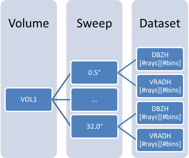 The organization of the data with this information model defines a volume of acquired operational weather radar data as a collection of two-dimensional “sweeps” of data, meaning a collection of radials or rays of data that scan the atmosphere either horizontally or vertically. While the information model recognizes the radial as the basic rational representation of data, the sweep is the representation starting point identified as relevant for international data exchange. Calibration metadata are defined to enable processing of quantitative outputs.