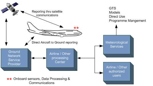 The AMDAR system utilizes predominantly existing aircraft onboard sensors, computers and communications systems to collect, process, format and transmit meteorological data - including air temperature, wind, turbulence and other required information - to ground stations via satellite or radio links. Once on the ground, the data is relayed to meteorological services, where it is processed, quality controlled and transmitted on the WMO Information System (WIS) from where it can be accessed and used by all WMO Members. More detailed information on how the AMDAR system works is available from the WMO Community Platform AMDAR site. | ||
