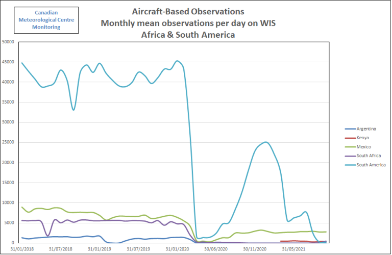 Status of Aircraft-Based ObservationsThe graphic below shows the smoothed monthly average of daily aircraft-based observations (single point measurements in space and time, mainly of air temperature and wind speed and direction, made by an aircraft) transmitted on the World Meteorological Organization (WMO) Global Telecommunications System (GTS) since 2007 up to October 2021, as contributed by: