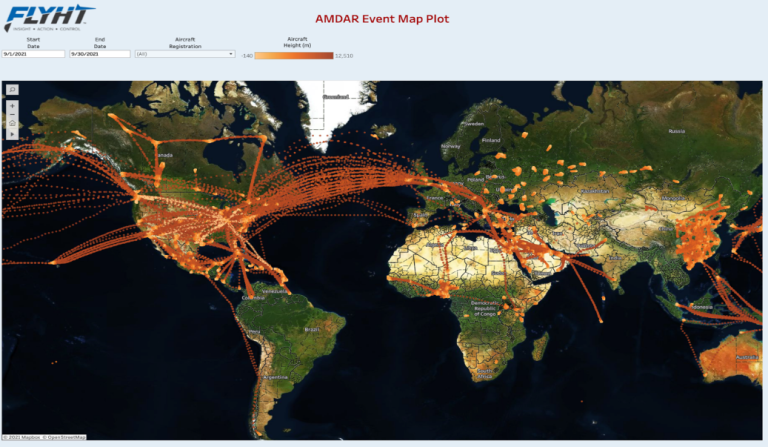 Lufthansa announced recently that all European WVSS-II aircraft will stop operations again in November 2021 and will be grounded until April 2022. No WVSS-II profiles over Europe can be expected during this period. The previously planned return of five of the remaining aircraft in Q4 2021/Q1 2022 will be postponed substantially but is still expected sometime in 2022. The return of the ninth aircraft only is planned for April 2023. The Met Office, UK continues planning a project to install a number of WVSS-II humidity sensors on UK-based aircraft. Delays caused by COVID have led to a reduced number of sensors being considered due to timing of available funds. A single-phase implementation of 30 sensors currently is scheduled to begin in late 2022/early 2023. Discussions with potential airlines are ongoing but as yet no firm commitment to participate has been reached. TAMDARFLYHT saw a steady increase in TAMDAR soundings over the summer months as COVID conditions improved and more people traveled during the summer holidays. However, in the past month we have experienced a slight decrease in soundings most likely due to people returning to work and school and therefore less likely to take a vacation. FLYHT believes the TAMDAR numbers will remain consistent over the next few months with a potential for growth in the sounding counts as the remaining installed TAMDAR fleet returns to service. The map below shows the TAMDAR observations for September 2021. FLYHT continues to see good data coverage over the Northwest U.S., Mexico, Asia as well as transatlantic flights.