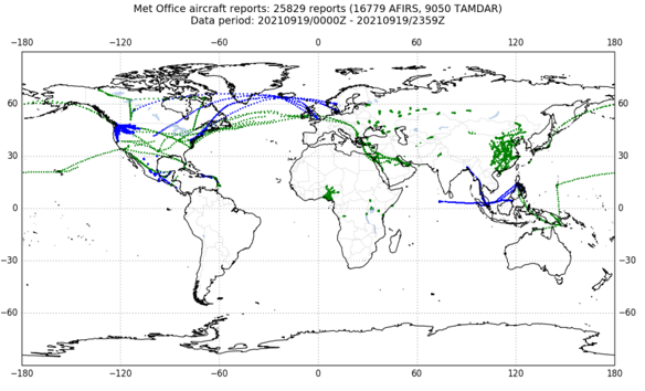 Figure 4 - Global coverage of AFIRS (green) and TAMDAR (blue) 19th September 2021. |