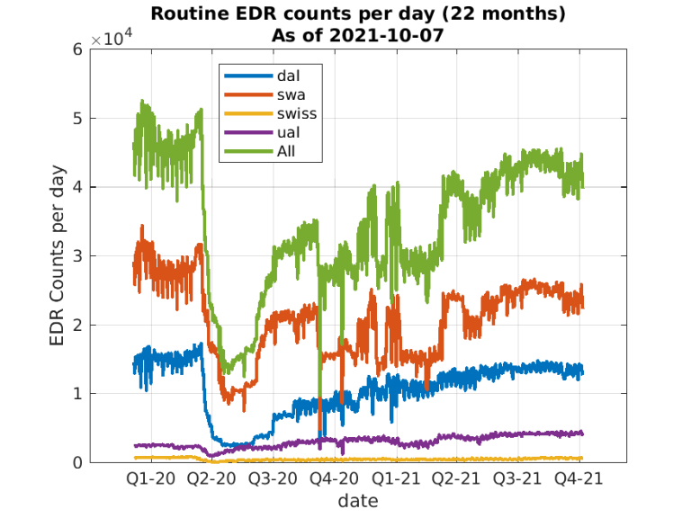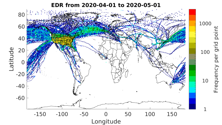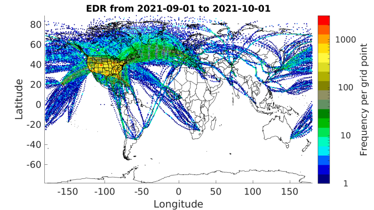 Aircraft-based Turbulence Observations Status within AMDARThere are two atmospheric turbulence intensity metrics currently in use by the AMDAR community. The first metric is eddy/energy dissipation rate (EDR). MacCready (1964) first suggested the use of EDR as a measure of turbulence intensity. It is particularly useful operationally since EDR along the vertical direction is proportional to the RMS (root-mean-square) vertical acceleration experienced by an aircraft for any given flight condition (MacCready 1964; Cornman et al. 1995). Further, EDR has been adopted as the standard metric for atmospheric turbulence reporting by the International Civil Aviation Organization (ICAO) (2001). Before the COVID-19 pandemic, more than 1300 aircraft were reporting EDR worldwide with an average of approximately 80,000 reports per day as of February 2020. However, as seen in Figure 1, which shows the approximate numbers of available routine EDR reports, beginning in March of 2020, a swift decline in the numbers of flights caused a drop in the EDR reporting to about 30% of pre-COVID-19 levels. Since then, reporting recovered slowly to about 95% of pre-pandemic levels before dropping more recently to about 90%. Figures 2, 3 and 4 show the locations of available1 EDR reports for September 2019 (before COVID-19), April 2020 (during the decline in reporting) and September 2021 (the most recent month) respectively. Currently, more than 1300 aircraft are reporting EDR worldwide with an average of approximately 65,000 reports per day. Since the number of reporting aircraft is now about the same as before the pandemic began, the lower reporting levels is likely due to an overall decrease in the number of flight hours. Indeed, comparing Figures 2 and 4, it is apparent that the number of trans-oceanic flights is significantly lower in September of 2021 compared with September of 2019.