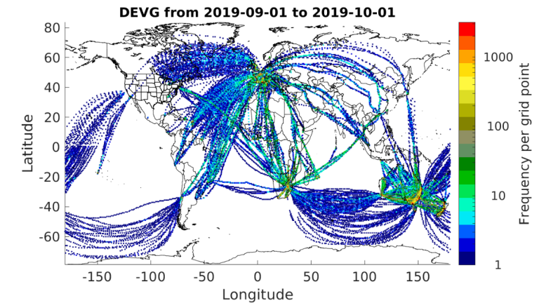 The second metric, derived equivalent vertical gust (DEVG), is defined as the instantaneous vertical gust velocity which, superimposed on a steady horizontal wind, would produce the measured acceleration of the aircraft. The effect of a gust on an aircraft depends on its mass and other characteristics, but these factors are accounted for so that a gust velocity can be calculated which is independent of the aircraft. Before the impacts of COVID-19 were truly felt by the aviation industry, more than 360 aircraft were reporting DEVG worldwide averaging about 20,000 reports daily. Starting in early March of 2020, DEVG reporting also dropped significantly, down to about 15% of pre-COVID-19 levels. These numbers are based on an analysis of AMDAR data from The U.S. National Centers for Environmental Prediction’s (NCEP) Meteorological Assimilation Data Ingest System (MADIS). A large fraction of the DEVG data appears under a few tail numbers, which is unrealistic, and thus the estimated number of aircraft reporting DEVG is substantially underestimated. Currently, there are at least 150 aircraft reporting about 16,000 measurements per day (about 80% of pre-COVID-19 levels). Figures 5, 6 and 7 show the locations of all DEVG reports for September 2019, April 2020 and September 2021, respectively. There is software-based logic implemented on many aircraft that limit reporting of DEVG in some regions at certain altitudes (e.g., Europe). DEVG reporting has increased over North America but continues to have limited coverage in the southern hemisphere.