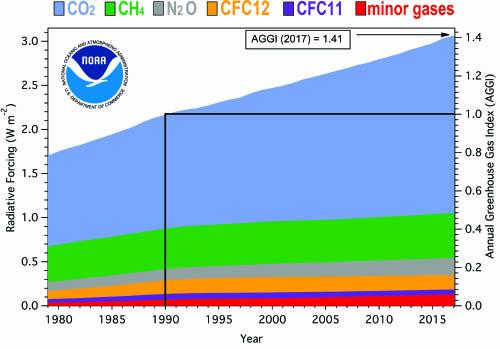 Atmospheric radiative forcing, relative to 1750, of LLGHGs and the 2016 update of the NOAA AGGI. |