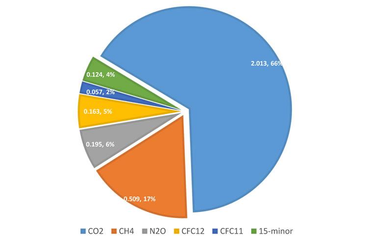 Figure 3. Increase in 2017 in global radiative forcing since pre-industrial times resulting from increased atmospheric burden of the most important LLGHGs, expressed in W per squire meter and relative to the total increase from all GHGs of 3.062 W m-2 [4]. |