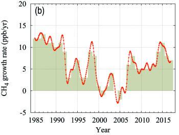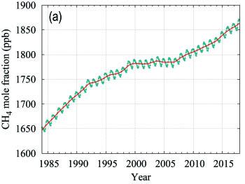 The results reported here by WDCGG for the global average and growth rate are slightly different from results reported by NOAA for the same years [6] due to differences in the stations used, differences in the averaging procedure and a slightly different time period for which the numbers are representative. WDCGG follows the procedure described in detail in [7].