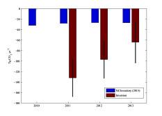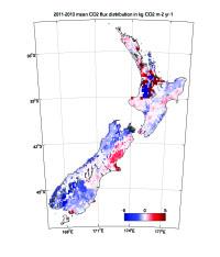 Figure 8. Geographic distribution of land-to-air CO2 flux, averaged over 2011–2013 [10]. Blue and red regions indicate net carbon uptake and release, respectively. Per-area ocean fluxes are too small to show on this scale. Fossil fuel emissions are included and reach up to 20 kg CO2 m-2 yr-1 in a few grid cells (Auckland area). The colour scale is capped to focus on natural fluxes. Inset: annual mean inverse model results [12] compared to the National Greenhouse Gas Inventory Report.