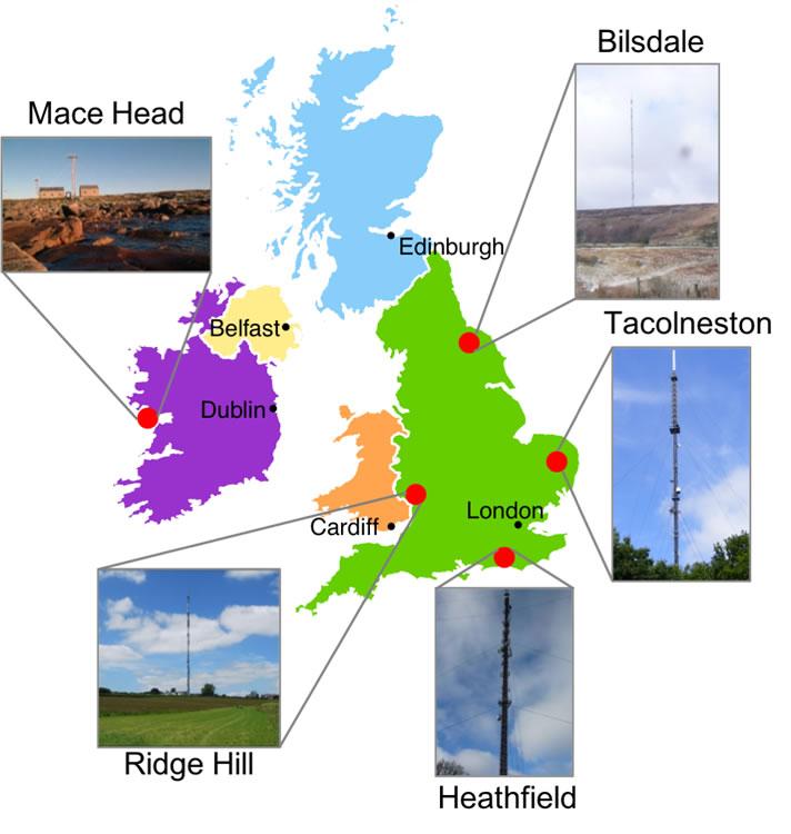 In 2012, BEIS invested in a network of observation sites (Figure 9) called the UK Deriving Emissions related to Climate Change (DECC) network [14]. These are primarily tall-tower telecommunication masts equipped with state-of-the-art observation equipment measuring CO2, CH4, N2O, HFCs, perfluorocarbons, SF6 and nitrogen trifluoride (NF3) to high precision and quality.