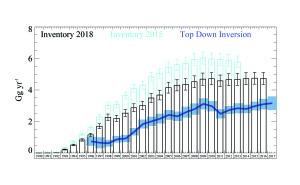Figure 10. United Kingdom emission estimates of HFC-134a. Inventory estimates from two reporting years compared against top-down (InTEM) estimates. |