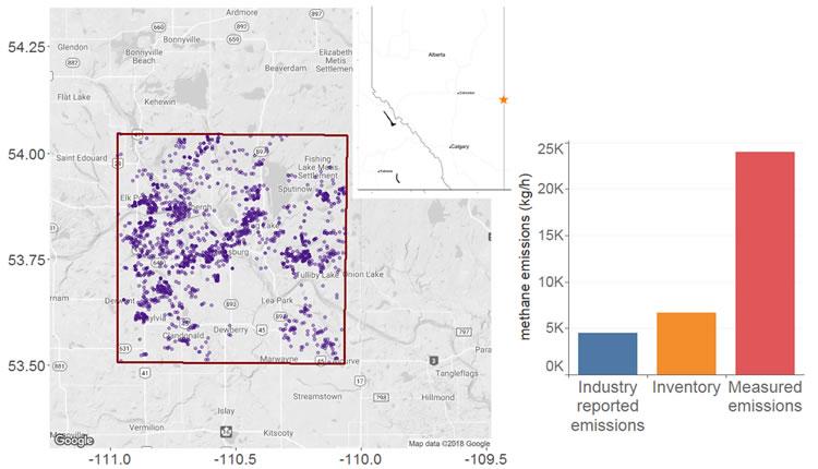 Figure 11. (a) Sampling region near Lloydminster, Alberta. The red box illustrates the source envelope where the aircraft took measurements. Purple dots inside the box represent active oil wells. (b) Comparison between measured CH4 emissions and “bottom-up” estimates based on inventory and industry reports. |