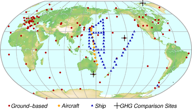 Figure 2. Figure 2. The GAW global network for CO2 in the last decade. The network for CH4 is similar.