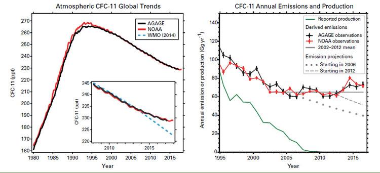 Atmospheric measurements of CFC-11 made by independent global networks show that since 2012 the rate of decrease in atmospheric CFC-11 has slowed to roughly two thirds of the rate that was observed between 2002 and 2012 [1, 2]. These global trends are shown in the left graph of the figure forthe Advanced Global Atmospheric Gases Experiment (AGAGE; shown in black) and the National Oceanic and Atmospheric Administration (NOAA; shown in red) measurement networks. Also shown in the inset to this graph is the trend that was predicted in 2014 by WMO (blue dashed) assuming adherence to the Montreal Protocol [3].