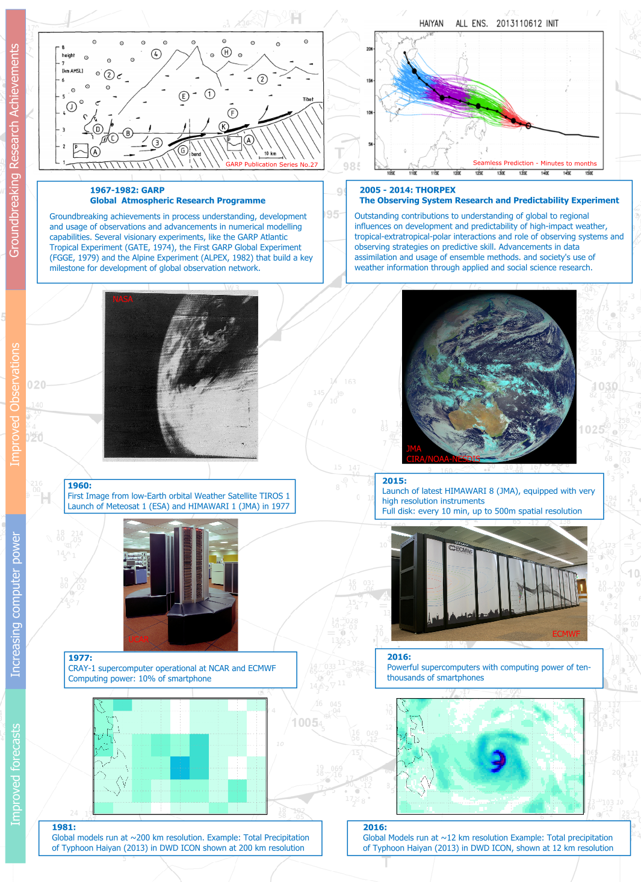 In 2003, WMO established an international atmospheric research and development programme, The Observing system Research and Predictability Experiment – THORPEX (Parsons et al. 2016). As a major 10-year programme, THORPEX built upon the highly successful 15-year Global Atmospheric Research Programme (GARP) initiated in 1967. While GARP focused on clarifying critical but poorly understood aspects of atmospheric dynamics, which eventually led to significant improvements in the accuracy of weather forecasts, the primary goal of THORPEX was “Accelerating improvements in the accuracy of 1-day to 2-week high-impact weather forecasts for the benefit of society, the economy and the environment”. THORPEX provided the essential framework for strong international collaborations in research into dynamics, predictability, and data assimilation, in major field experiments, in the exploitation of observation technologies and the development and use of ensemble prediction techniques. THORPEX fostered increased cooperation between the academic research community and National Meteorological and Hydrological Services (NMHS). Major achievements of THORPEX include addressing the potential of targeted observations through field campaigns, improved understanding of dynamical processes, developing and evaluating new data assimilation techniques and increasing the value of large multi-model ensemble prediction systems through the THORPEX Interactive Grand Global Ensemble (TIGGE) database. Progress has also been made in facilitating the development and application of new and improved verification methods to assess and enable improvement of the quality of weather forecasts, and in the provision of nowcasting information and mesoscale predictions.